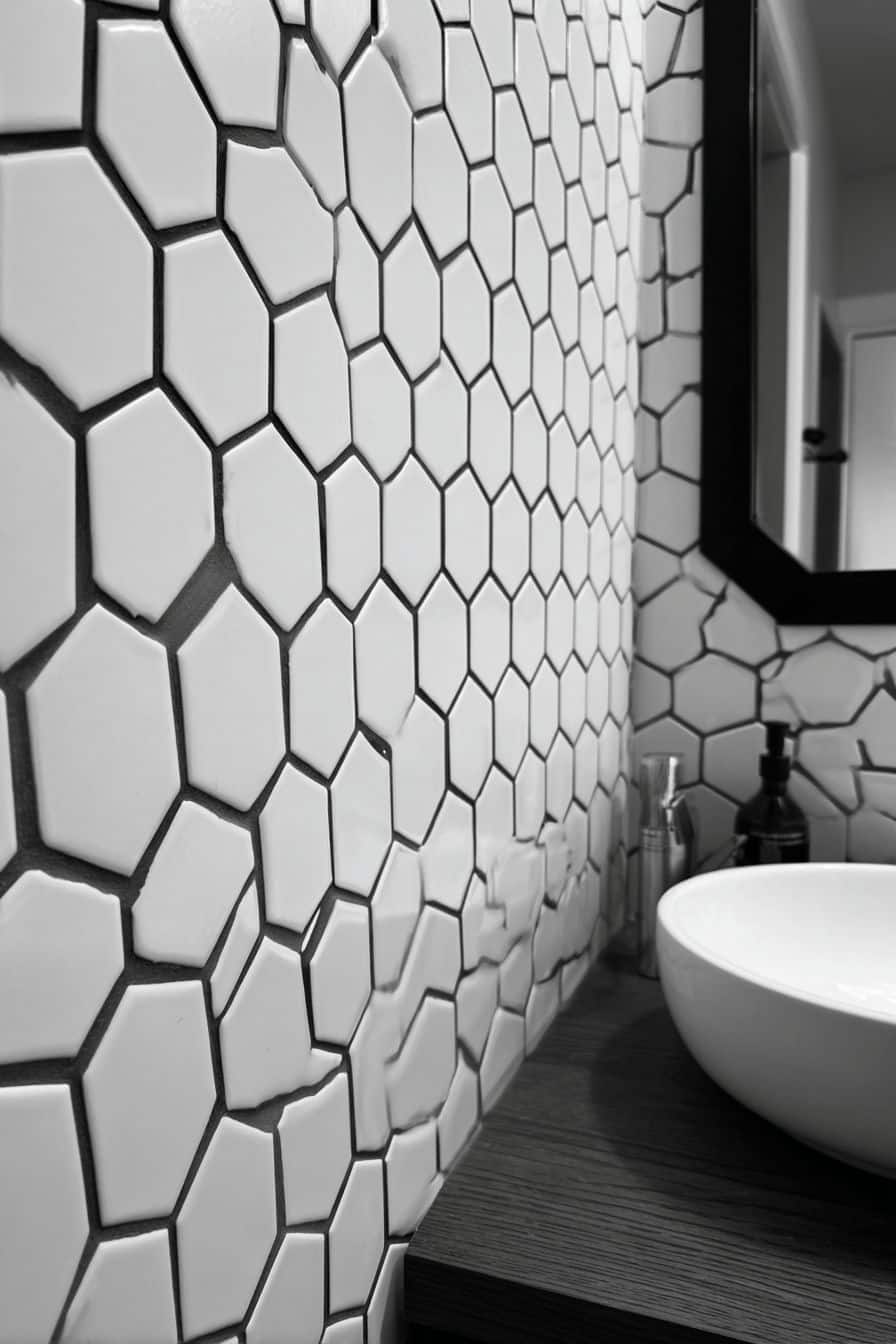 This bathroom features white hexagon tiles paired with dark grout, creating a bold geometric pattern that immediately catches the eye. The contrast between the crisp white tiles and the dark lines emphasizes the shape of each tile, giving the wall a textured, almost 3D effect.