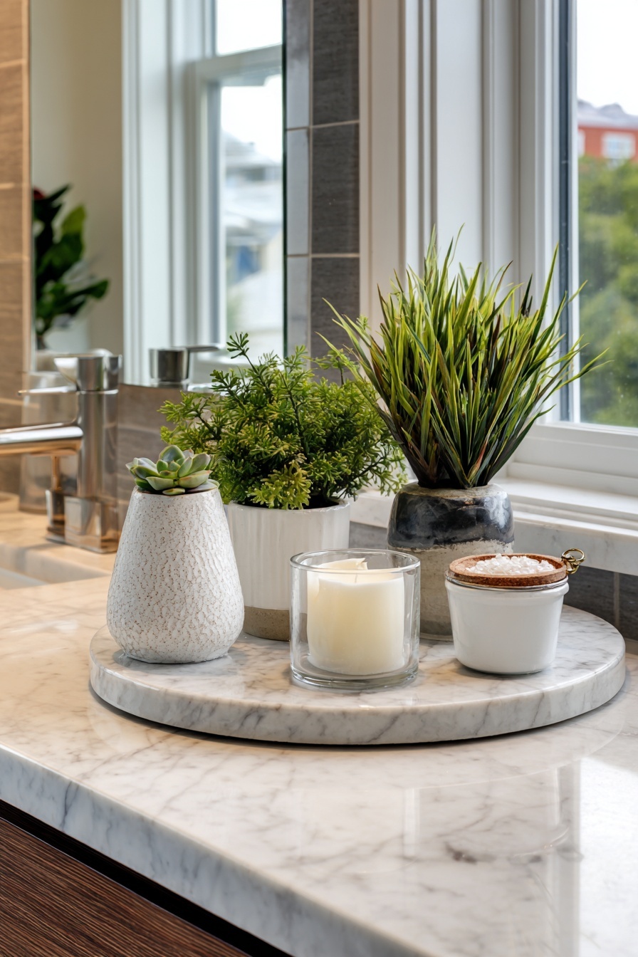A round marble tray anchors this arrangement, holding candles and small plants.