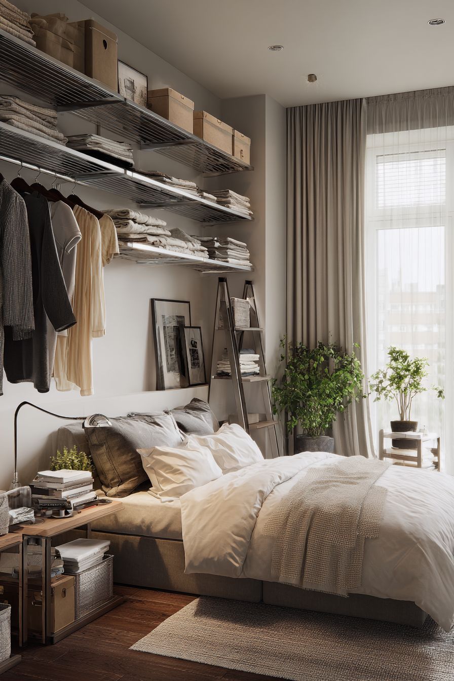 This design uses vertical wall space efficiently by installing open shelving above the bed. The shelves hold neatly folded clothes, storage boxes, and decorative items, keeping essentials within reach without taking up floor space.