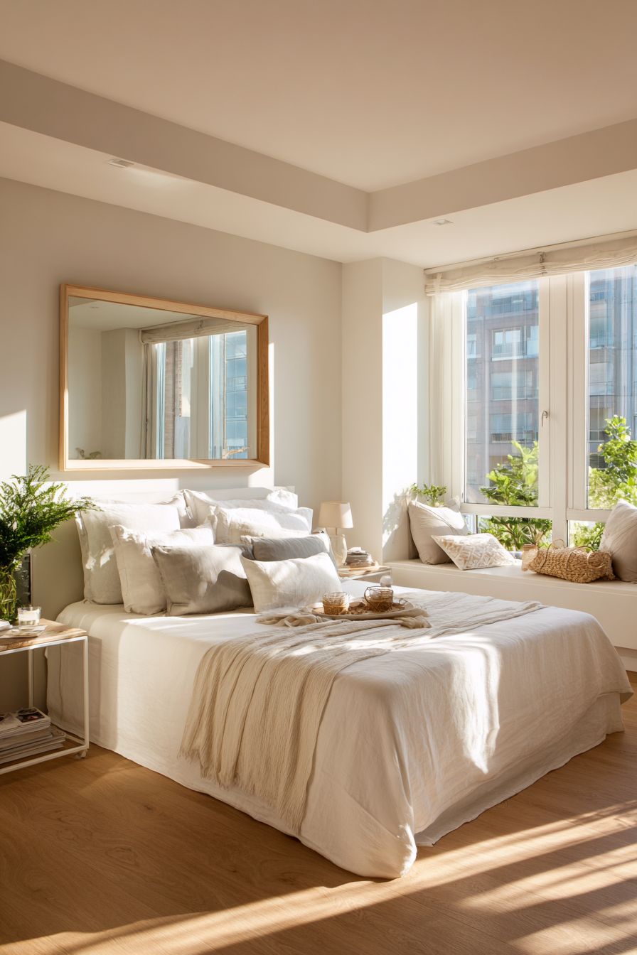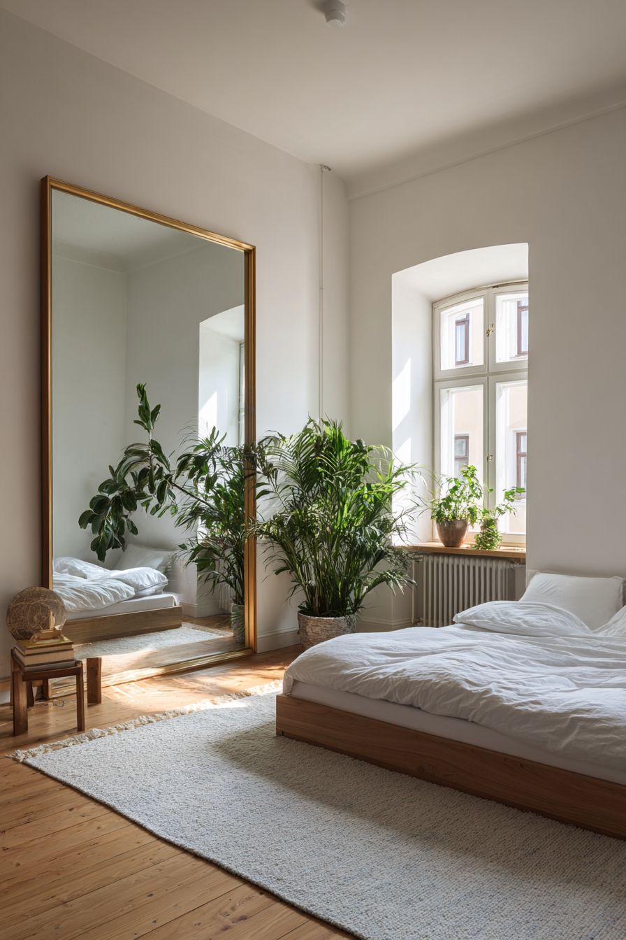 A low-profile floor bed paired with a large mirror creates the illusion of a bigger space. The mirror reflects light, making the room feel brighter and more open.