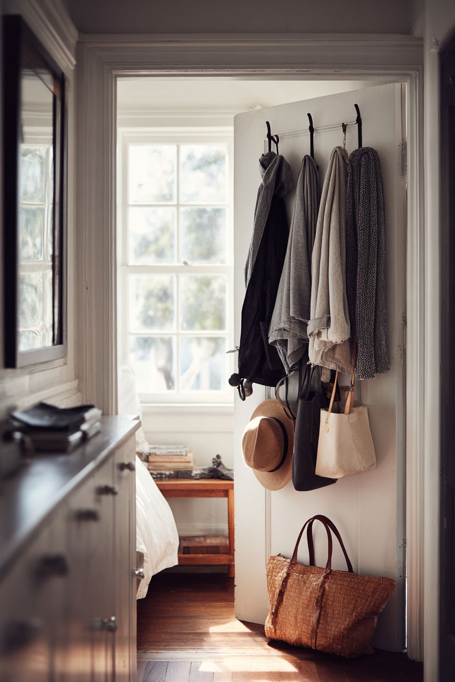 Using wall hooks behind doors or on empty walls is a simple yet effective storage solution. It’s perfect for hanging bags, hats, or everyday items.