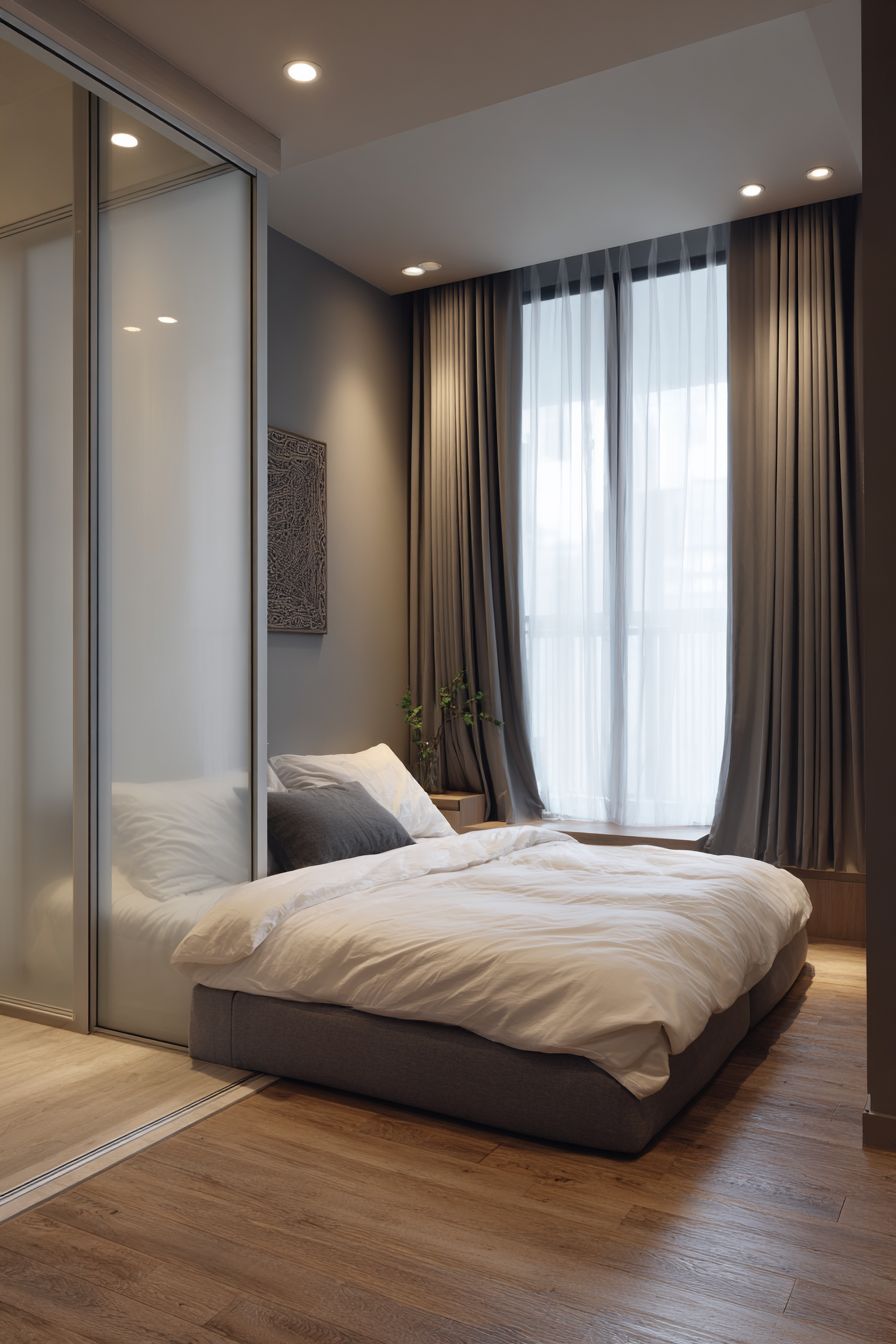 This bedroom focuses on simplicity and soft textures. While storage is subtle, it’s integrated through minimal furniture and hidden compartments.