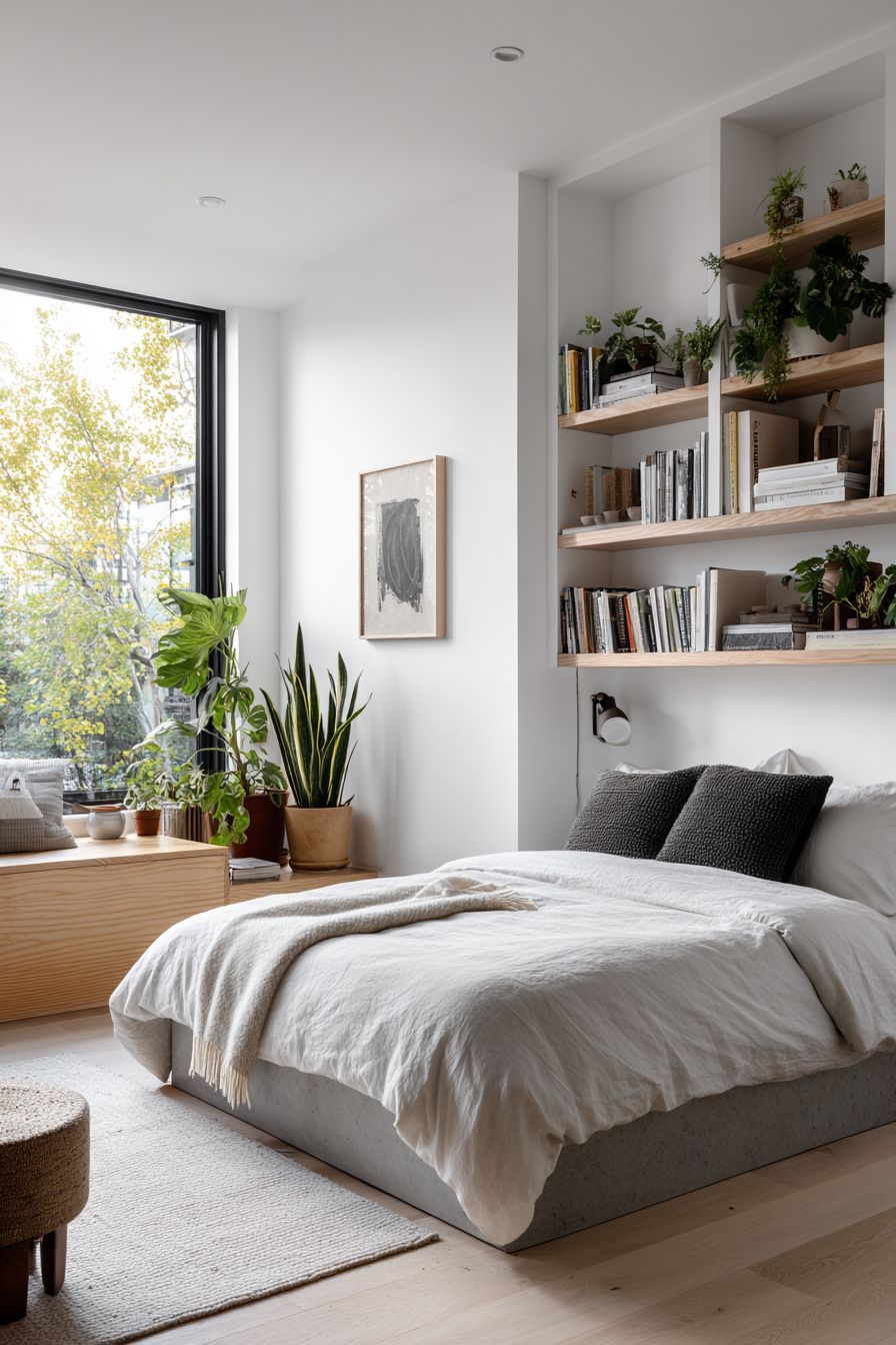 Custom built-in shelves surrounding the bed provide both storage and a cozy, enclosed feeling. Books, decor, and essentials are easily accessible without cluttering the room.