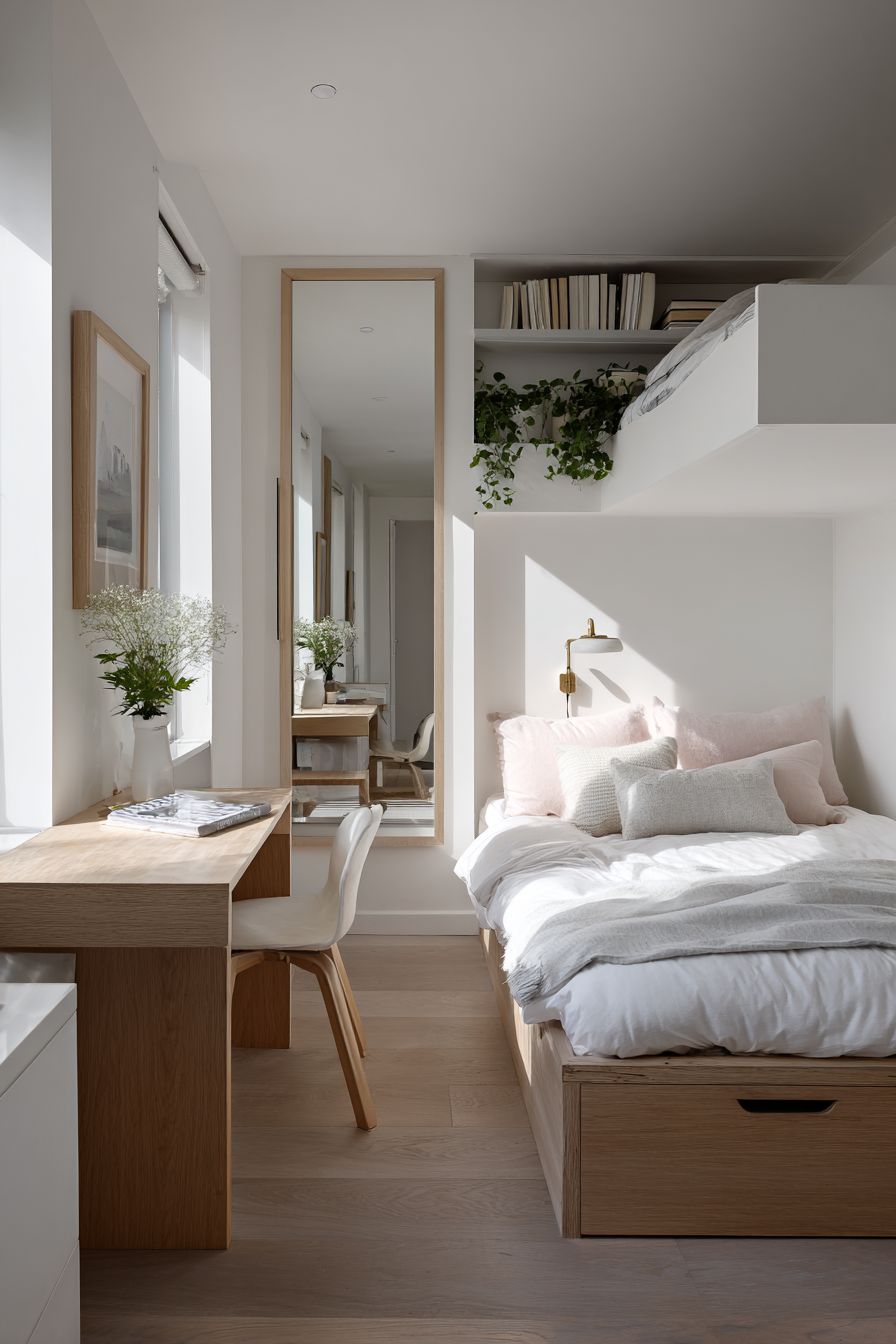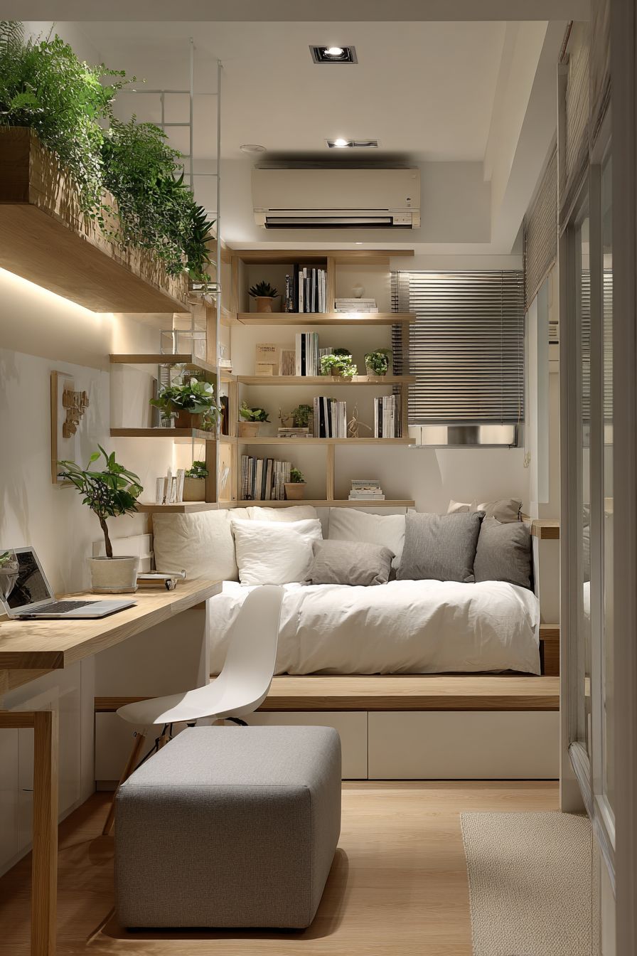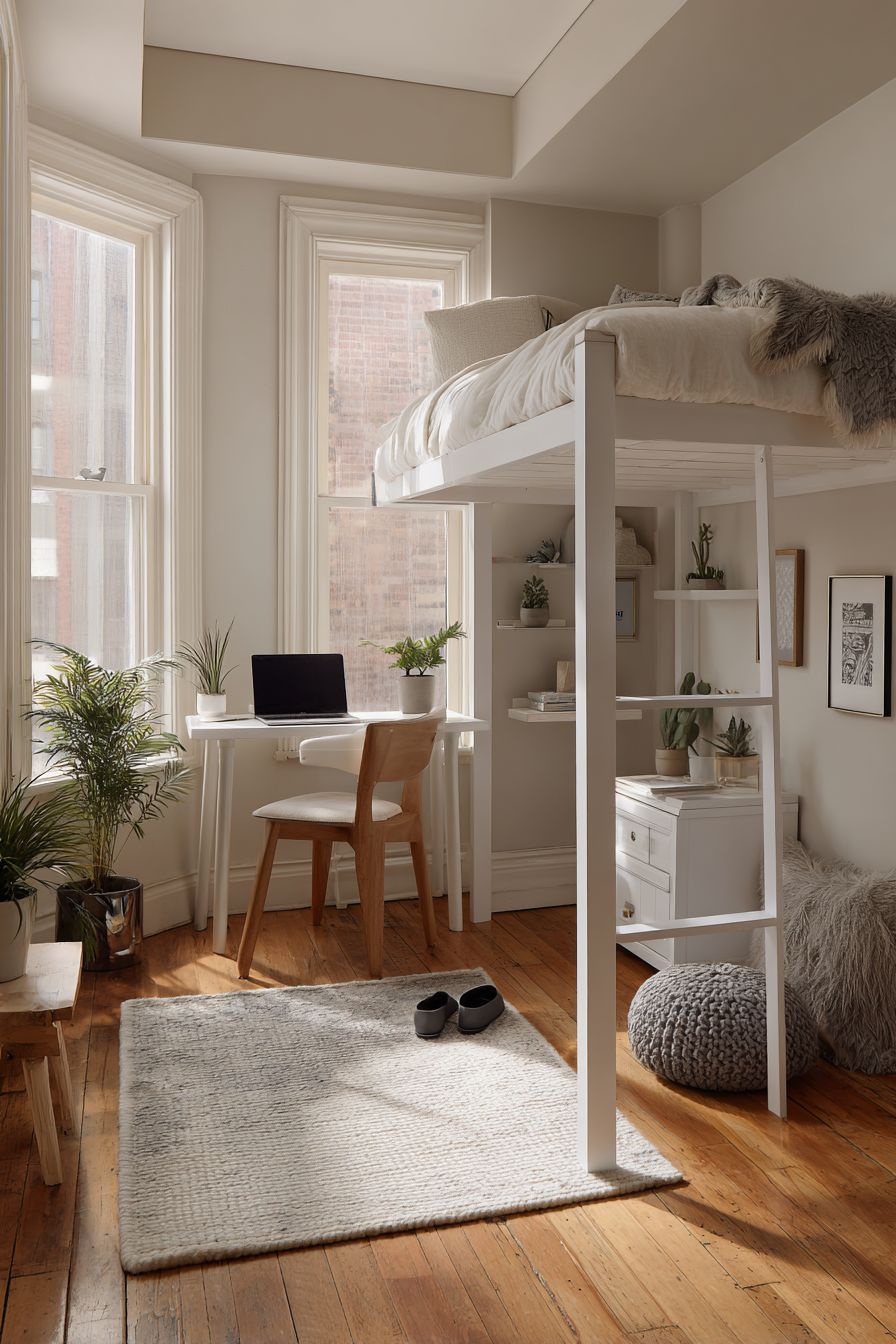 This is perfect for small apartments or student rooms. It allows you to maintain a dedicated work area without compromising sleeping comfort. The addition of plants and natural light enhances the overall atmosphere.