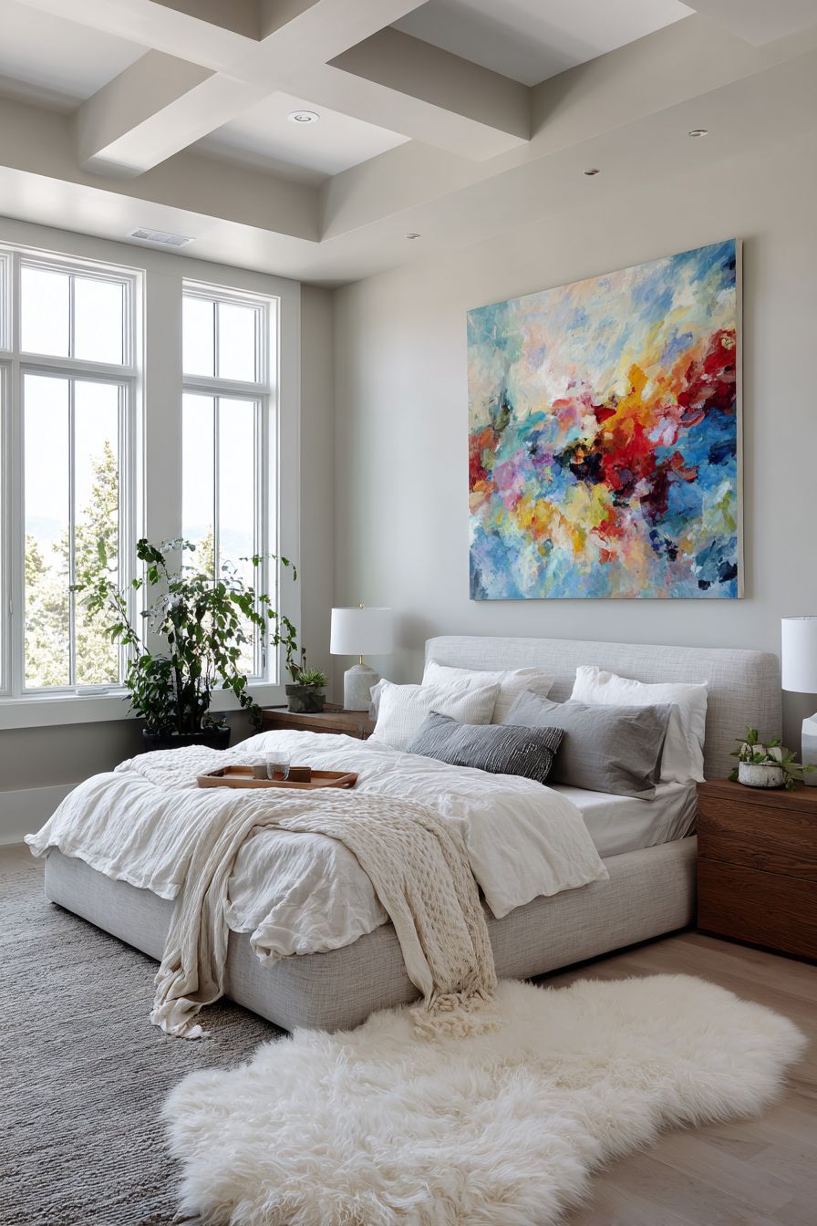 This bedroom combines functional storage with a strong visual focal point—a large artwork above the bed. Nightstands and soft furnishings keep the space organized without overwhelming it.