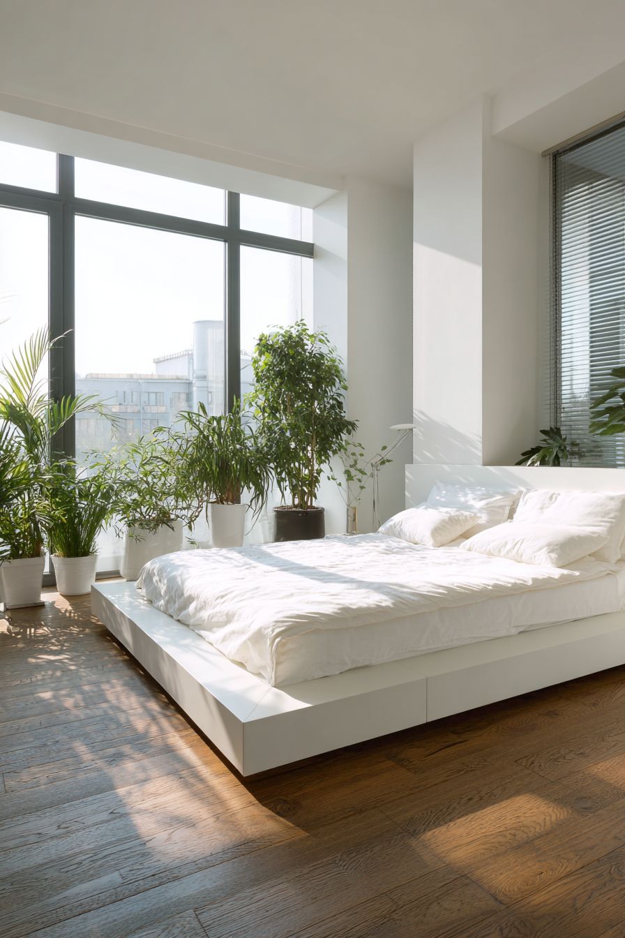 Plants add a natural touch while keeping the design fresh. Storage is kept minimal, emphasizing a clean and airy atmosphere.