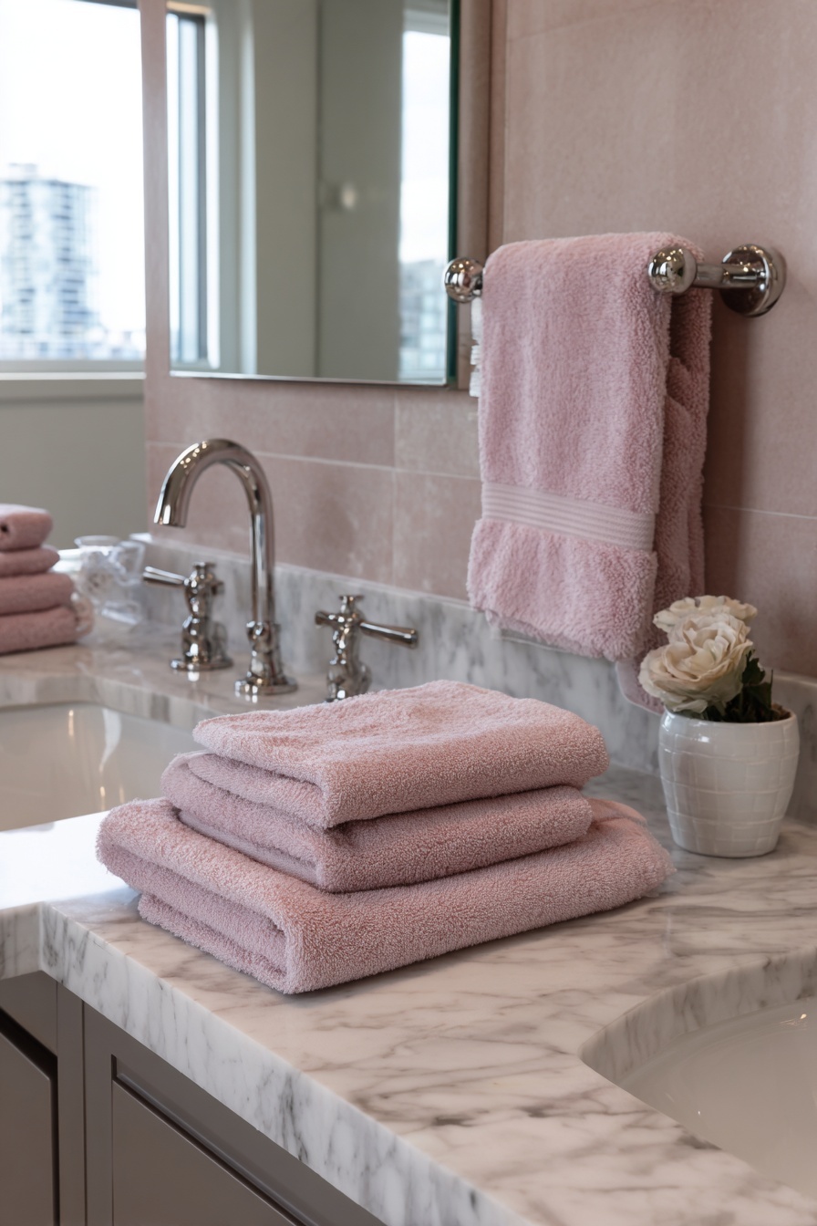 This bathroom keeps things simple with a predominantly white palette, enhanced by soft pink accents like towels and decor pieces.