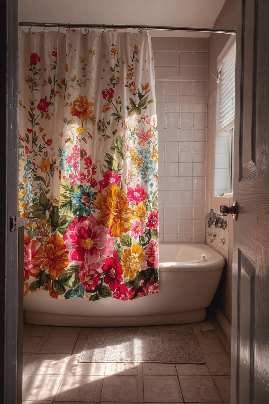 A bold floral shower curtain is one of the easiest ways to transform a bathroom without any renovation. In this setup, the curtain features vibrant blooms in shades of red, yellow, and pink, instantly creating a cheerful and welcoming atmosphere.