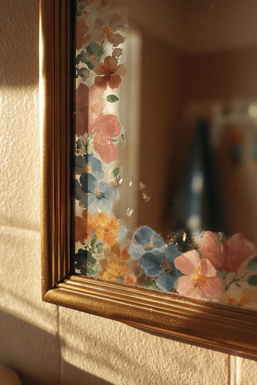 A mirror with floral detailing adds a touch of vintage charm. The soft reflections and warm lighting create a nostalgic, cozy atmosphere.