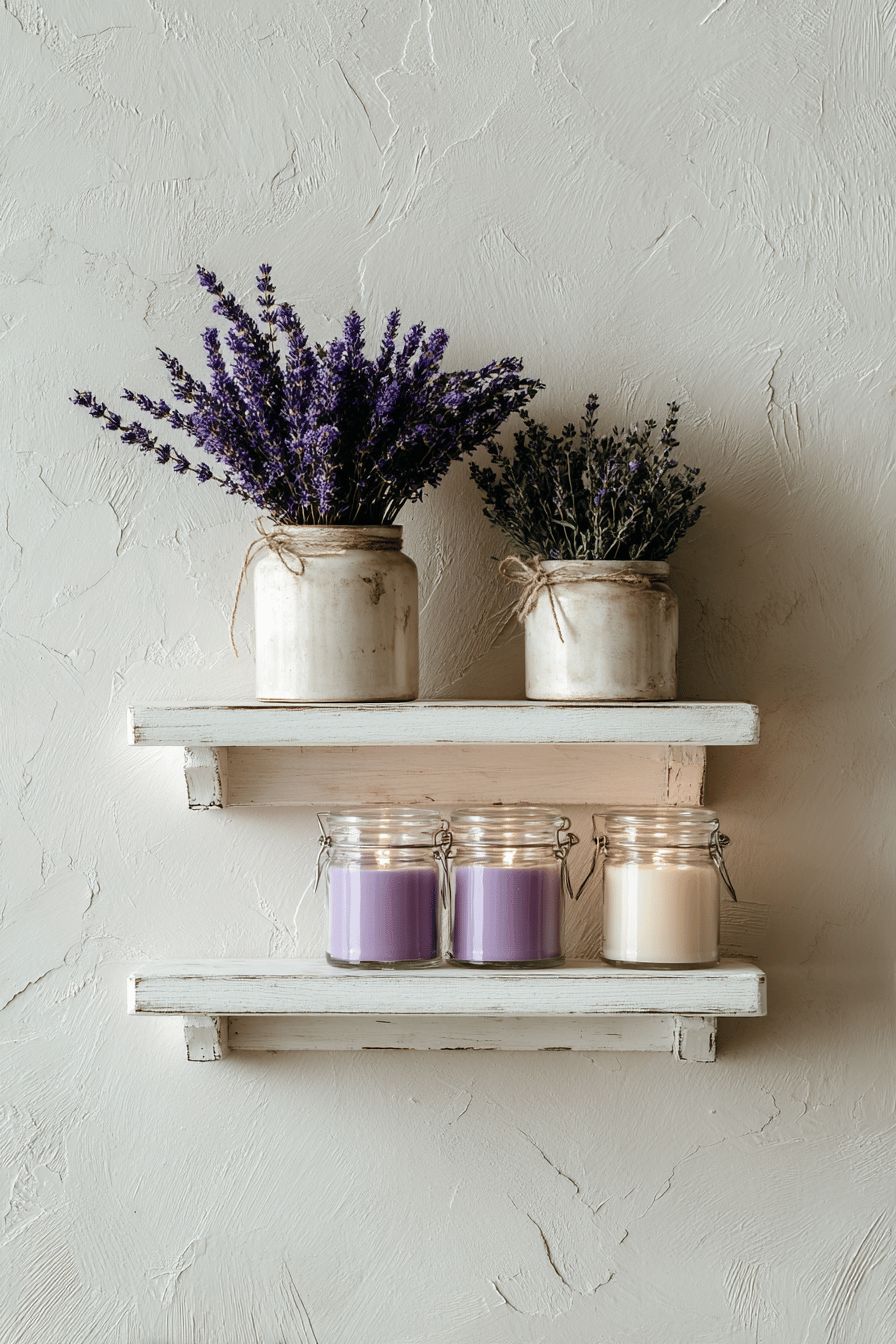 Simple wall shelves with candles and dried lavender create a clean and relaxing aesthetic. The neutral tones and natural materials keep the look timeless.