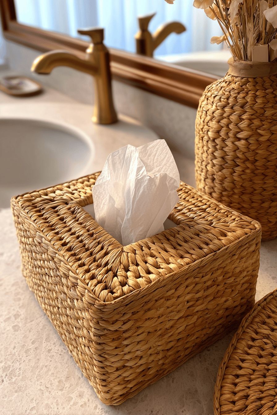 A woven tissue box is a small but impactful detail. It adds texture and warmth, blending seamlessly with other natural elements in the bathroom.