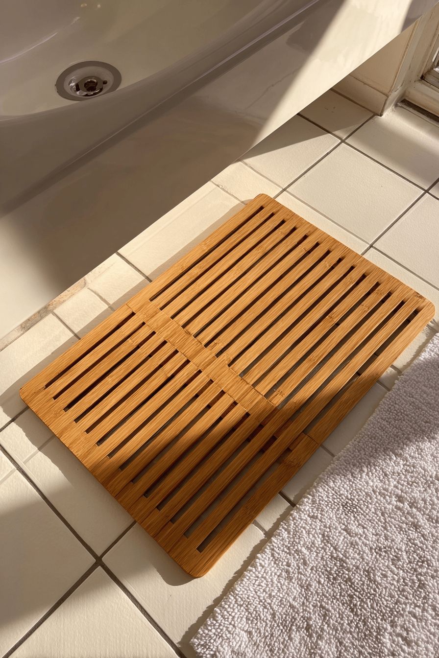 A wooden bath mat brings a modern, spa-inspired touch to your bathroom. Its clean lines and natural material create a sense of luxury and simplicity.