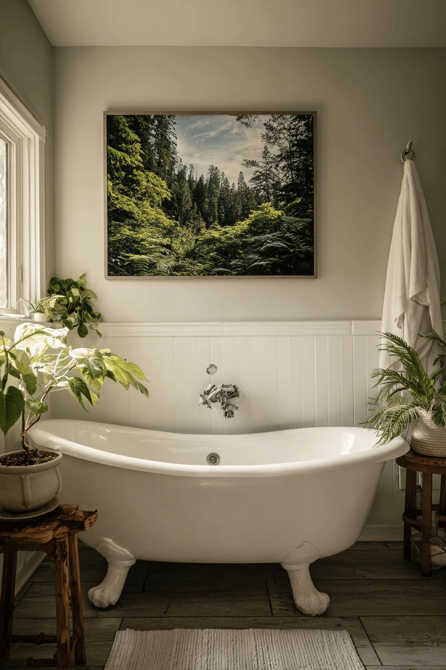 A freestanding bathtub always feels luxurious, but when combined with plants and natural textures, it becomes even more inviting. The addition of greenery and a large nature-inspired wall art piece creates a spa-like environment.