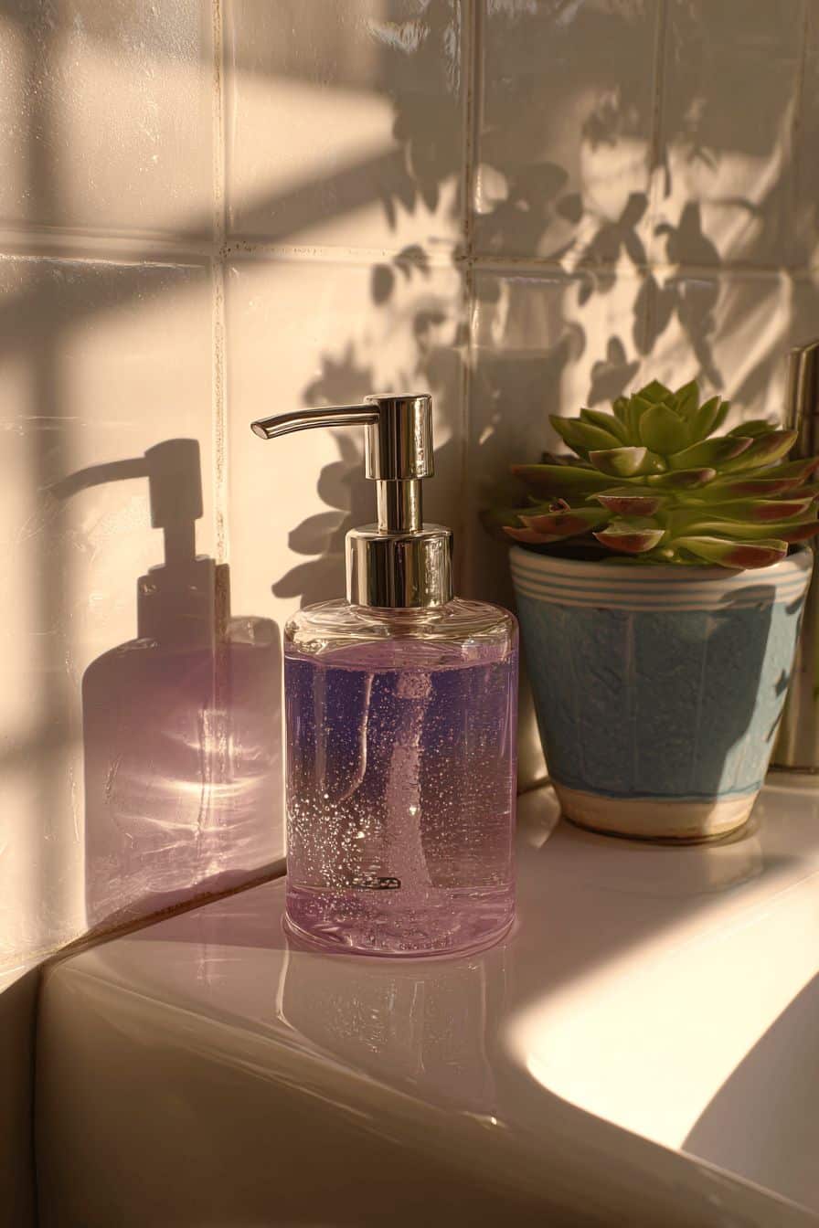 The sunlight hitting the surface adds depth and warmth, while the subtle purple tone of the soap introduces a gentle pop of color. This setup proves that even everyday items can contribute to your decor.