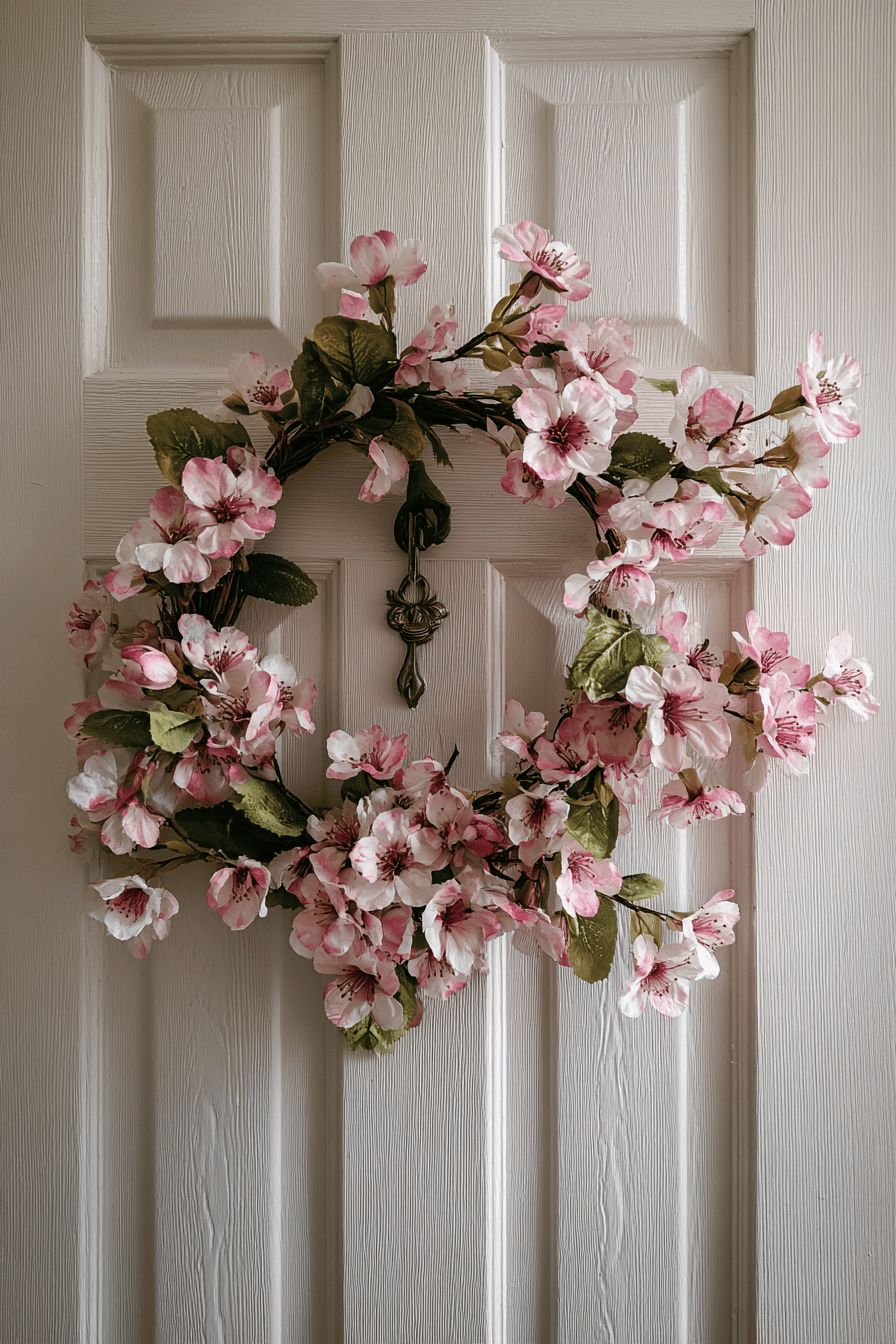 A floral wreath on the bathroom door adds a delicate and welcoming touch. The soft pink blossoms bring a sense of spring without being overpowering.