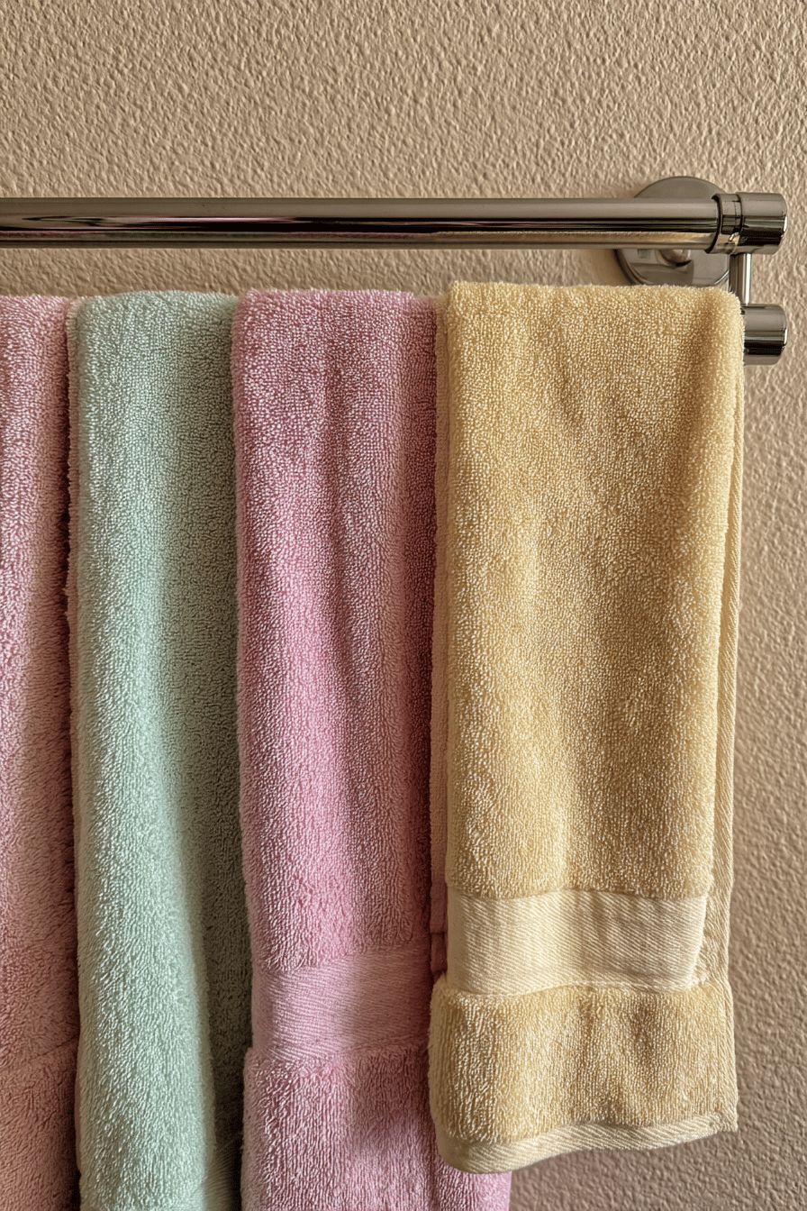 Pastel-colored towels instantly make a bathroom feel lighter and more seasonal. The combination of soft pink, mint green, and warm yellow creates a balanced and soothing palette.