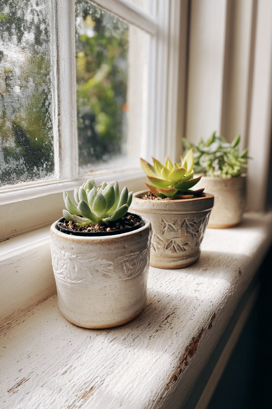 Small succulents placed on a windowsill are perfect for adding greenery without requiring much maintenance. The natural light highlights their textures and shapes, creating a calm and organic feel.